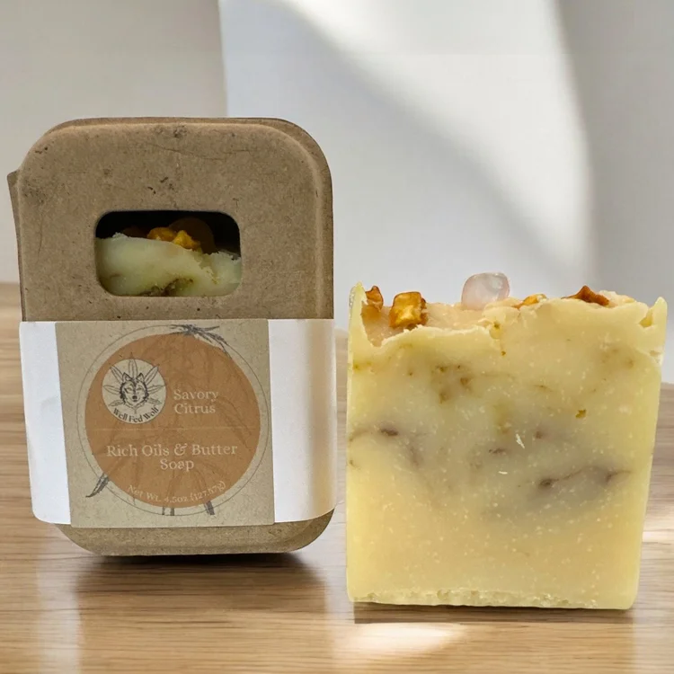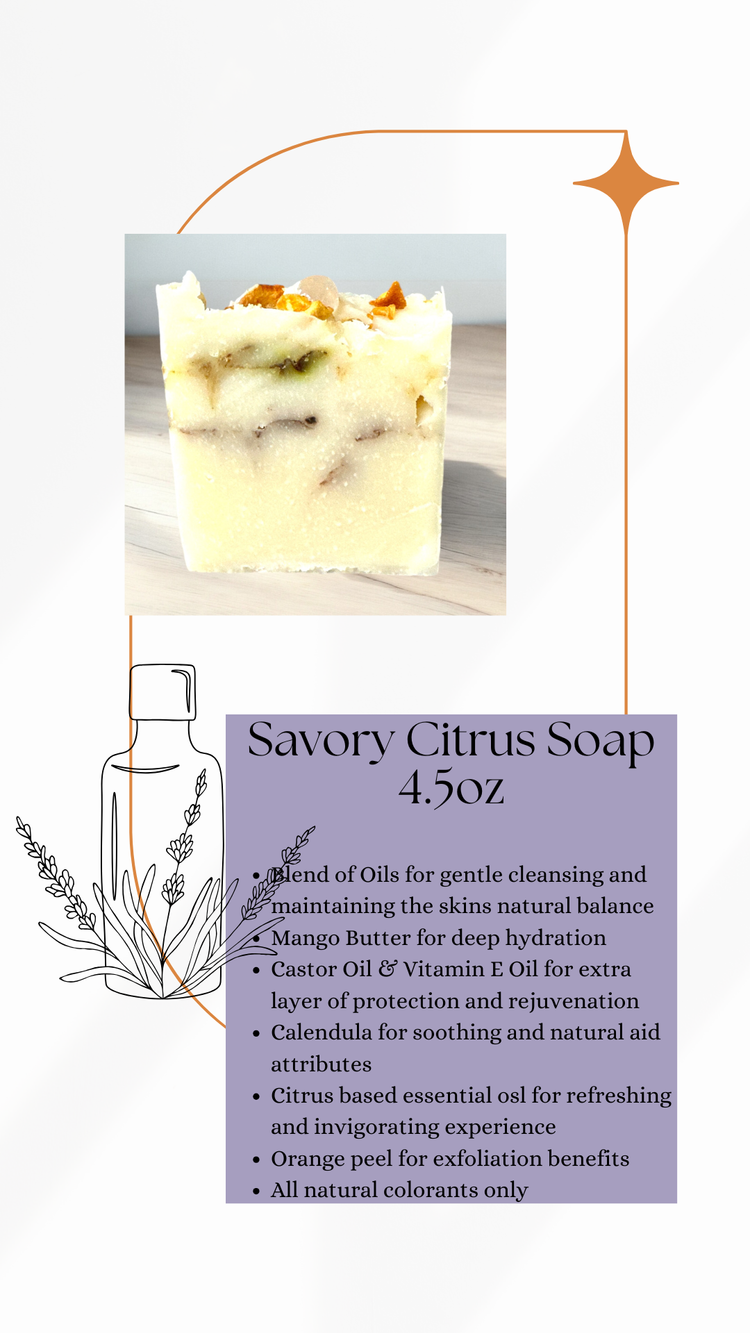 Our soap is suffused with a delightful medley of Calendula and essential oils of Grapefruit (Citrus Paradisi), Tangerine (Citrus tangerine), and Rosemary (Salvia Rosmarinus), each chosen for their therapeutic properties and ability to uplift and renew the spirit. Calendula, celebrated for its healing-like attributes, soothes the skin, while the citrus ensemble energizes and refreshes, leaving behind a clean, invigorating scent that enlivens the senses.