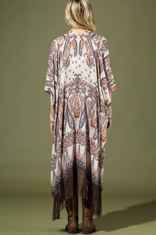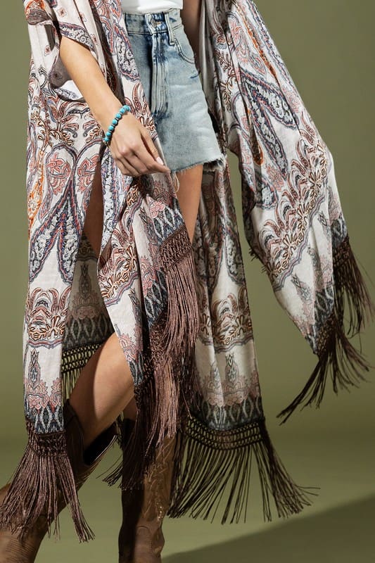 Add a touch of flair to your wardrobe with this lightweight, one-of-a-kind kimono that blends beautiful paisleys with an ethnic vibe. Crafted from soft, flowing textured jacquard and finished with a charming trim, it’s a standout piece that shows off your unique style and works for any occasion.