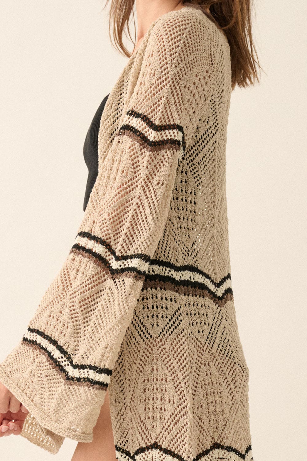 A striped crochet knit kimono cardigan featuring a geometric pattern, open front with tie closure, long bell sleeves, ankle length, and a relaxed fit.
